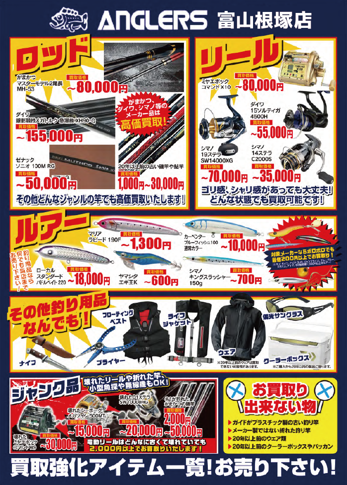 ぜひアングラーズ富山根塚店様に使わなくなった釣具をお持ち込みください!