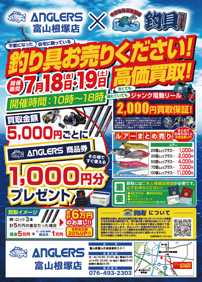 期間中は10時~18時までアングラーズ富山根塚店様にて特設買取ブースを設置いたします。