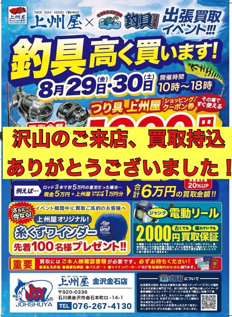 改めてご来店、お持ち込みいただいたお客様ならびに上州屋 金沢金石店様のスタッフ皆様、重ねて感謝申し上げます
